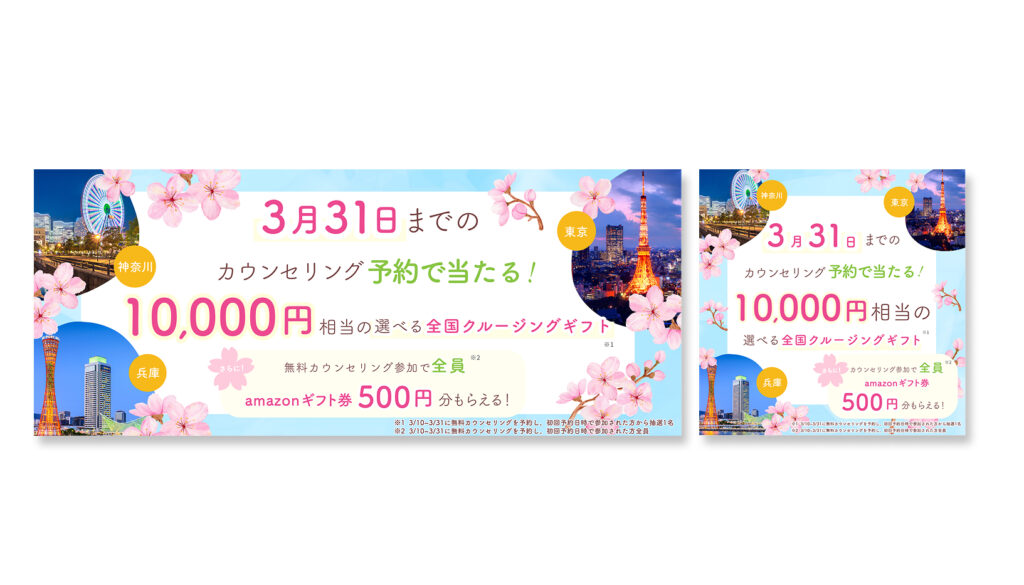 バナー制作 2025年6月28日 Last updated : 2025年6月28日 yuma 【製作時間】3時間/1枚【使用ソフト】Photoshop・illustrator【担当業務】デザイン【意識した亊】春らしい季節感が伝わるデザインにしました。